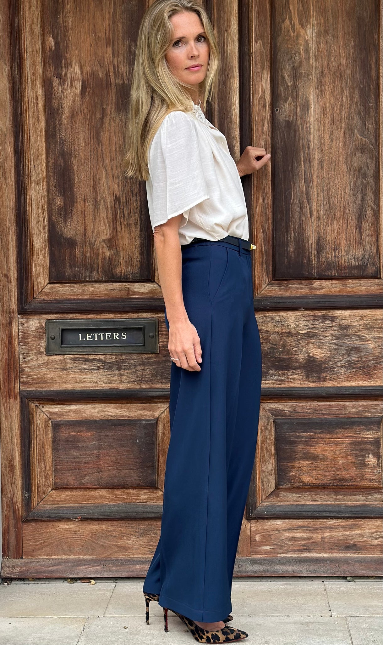 We adore these sophisticated navy wide leg trousers which are perfect to take you from day to evening. Flattering and leg elongating with a comfortable elasticated waist at the back.