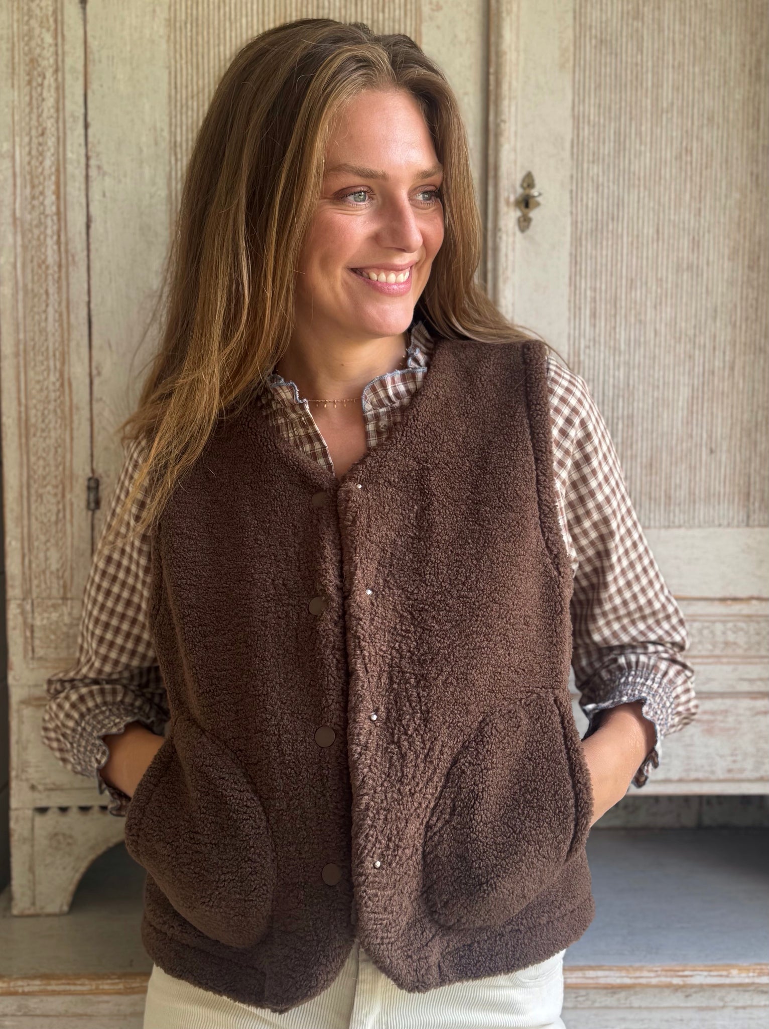This soft faux sheepskin gilet with poppers and large pockets was such a success that we have brought it back this season in this new autumnal colour. The perfect layer to throw on over a jumper on those chiller mornings.
