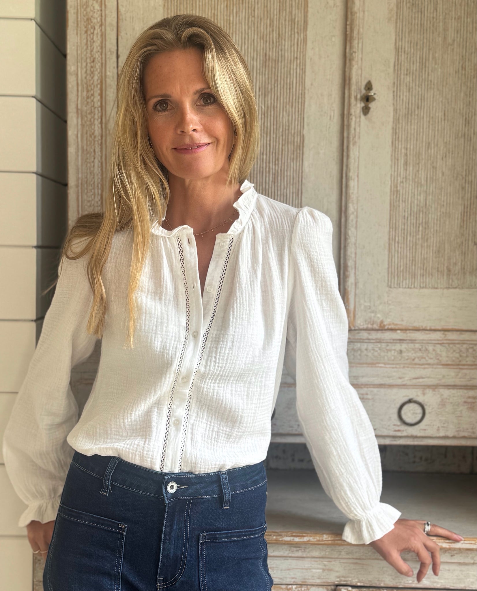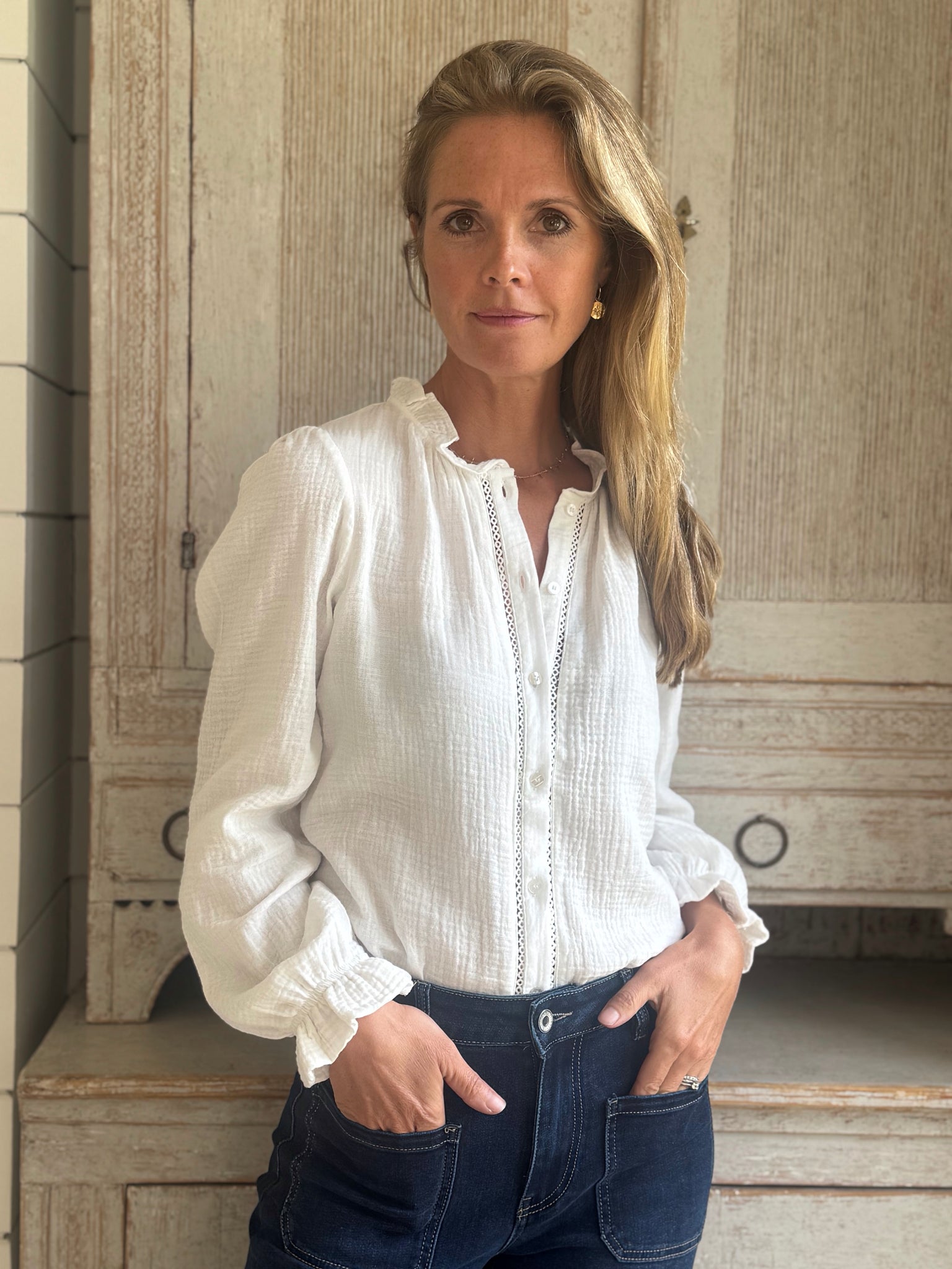 The Sophie is a pretty, classic everyday shirt. In the softest cheesecloth cotton with gentle elasticated ruffle at the cuff and collar and lace detailing, this is a piece you will be reaching for time and time again. A beautiful shirt on its own but the pretty collar and cuffs make it perfect with a jumper thrown over it too.