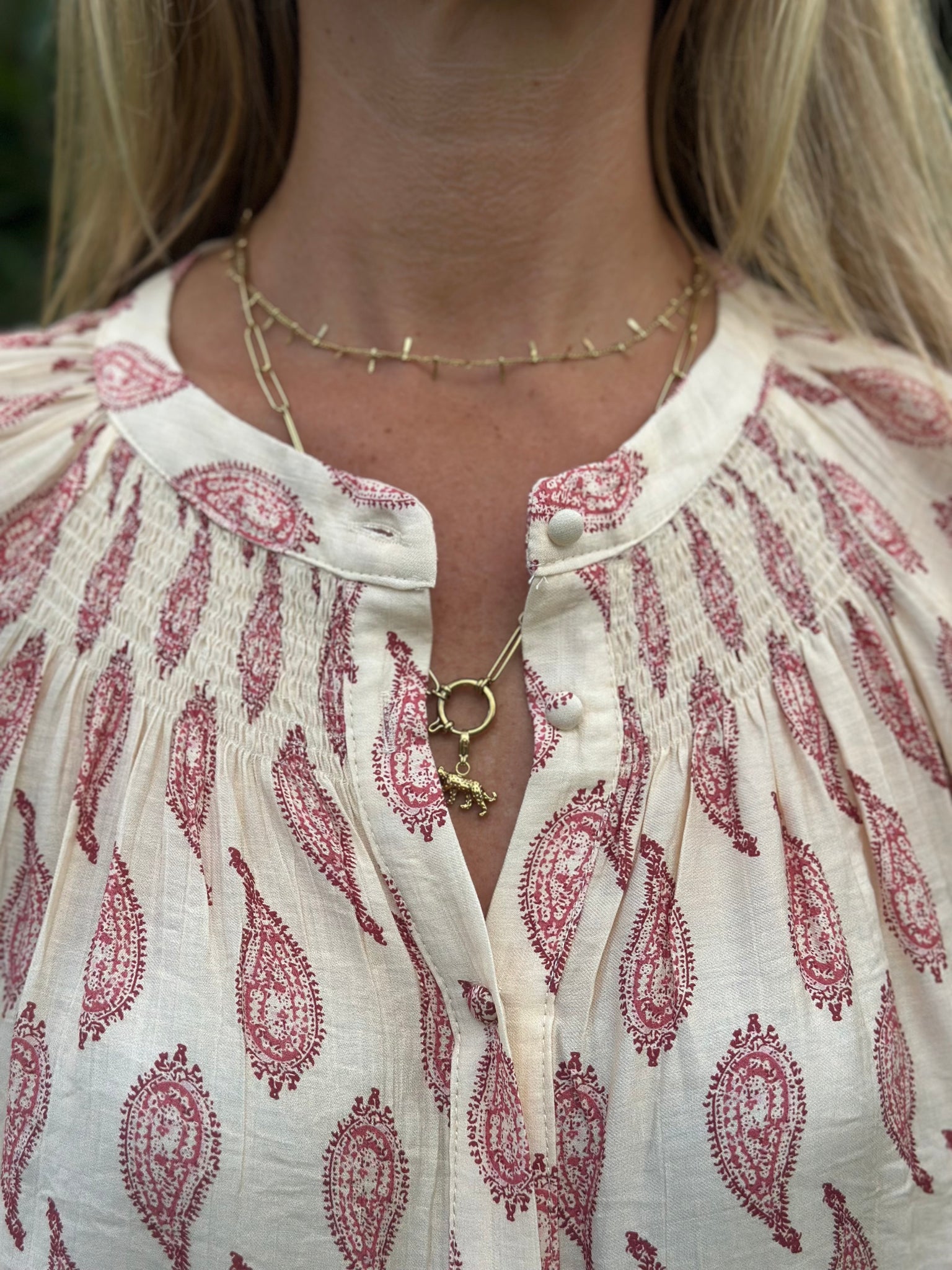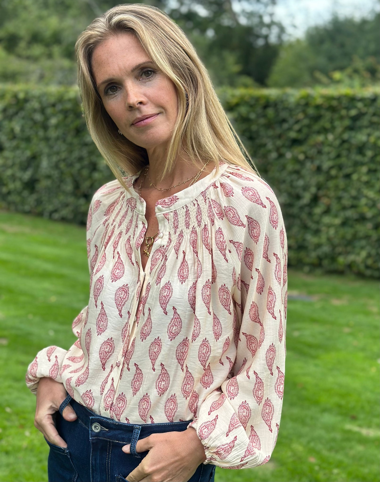 We love the Pia - a very pretty paisley print shirt with gentle smocking at the neck, elasticated cuffs, and covered buttons. This is a great shirt to elevate your every day look and add a little colour to your wardrobe this autumn.