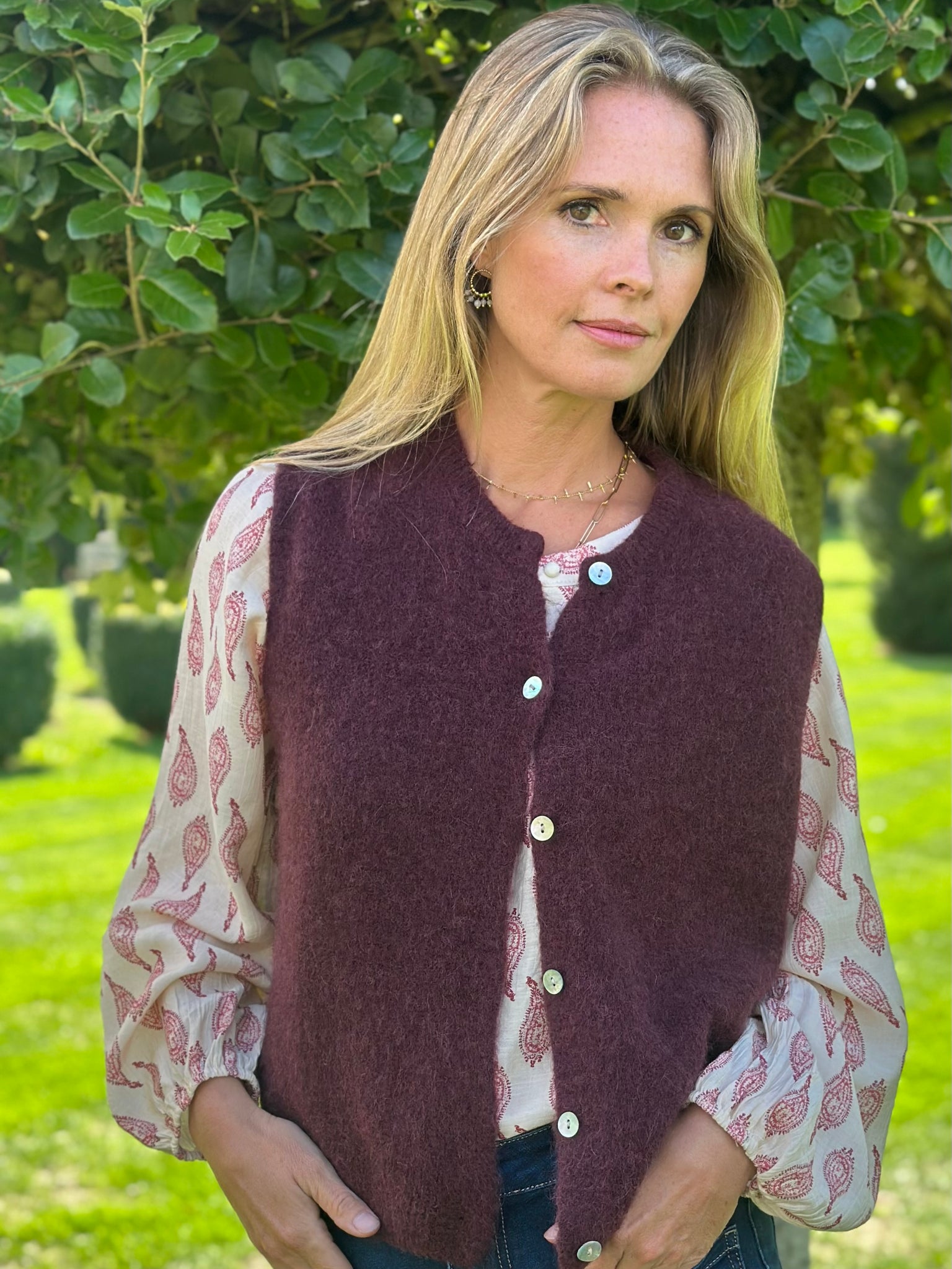 Seen here with Wide Leg Blue Jeans, Joanna Gilet, Cashmere and Wool Mix Burgundy Scarf, Layering Necklace, and Leopard Charm Chain Necklace